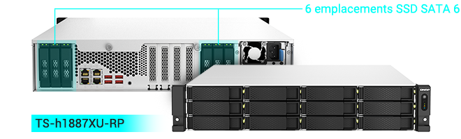La série des NAS montés en rack TS-hx87XU-RP présente des architectures uniques de 6 emplacements de x baies de lecteur, avec 6 baies SSD 2,5 pouces et 12/16/24 baies HDD. |